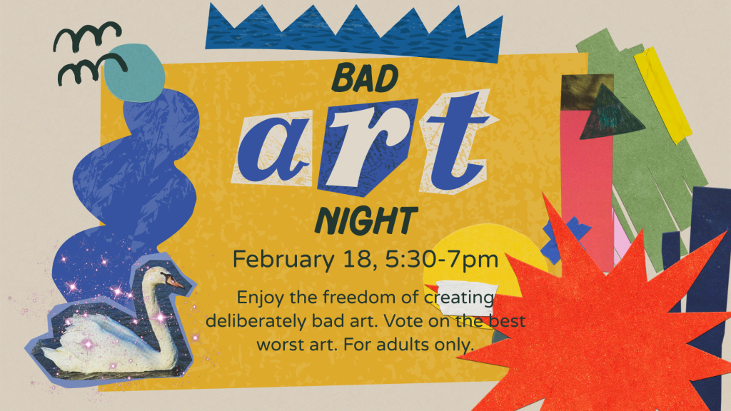 Enjoy the freedom of creating deliberately bad art. Vote on the best worst art. This program is for adults 18+ only. All supplies are provided. Bring your creativity and leave your inner critic at home! Bad Art Night is Wednesday, February 18, 2026, from 5:30-7:00pm.