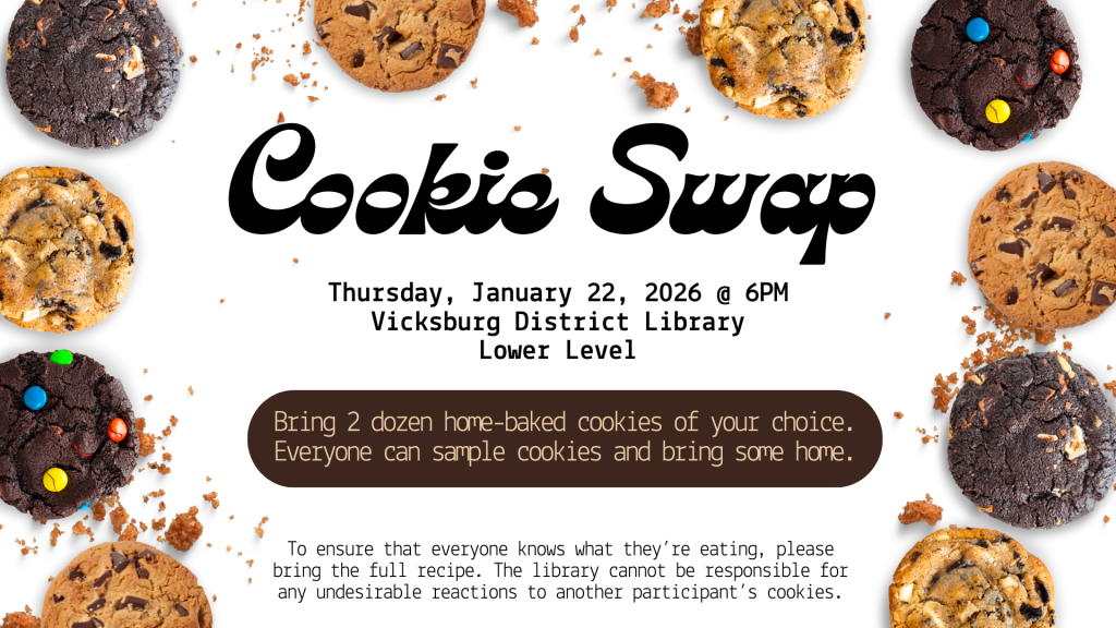 Bring 2 dozen home-baked cookies of your choice. Everyone can sample cookies and bring some home. There will be hot drinks (coffee, tea, cocoa), water, and a non-sweet snack to eat between cookies. To ensure that everyone knows what they’re eating, please bring the full recipe. The library cannot be responsible for any undesirable reactions to another participant’s cookies. Cookie Swap takes place on Thursday, January 22, 2026, at 6:00pm.