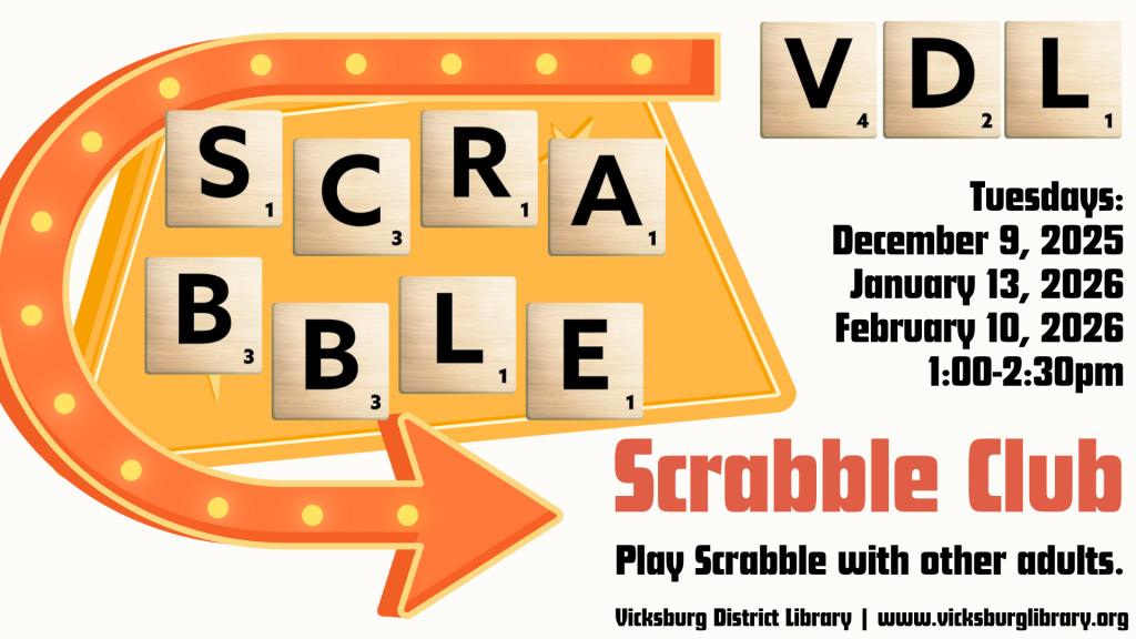 Play the board game Scrabble with other adults at the library. Scrabble Club meets on Tuesdays, December 9 (2025), January 13 (2026), February 10 (2026) from 1:00-2:30pm.