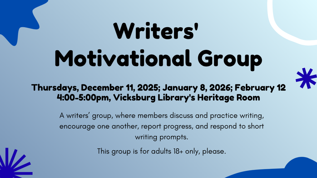 A writers’ group where members discuss and practice writing, encourage one another, report progress, and respond to short writing prompts. This program is for adults only. We meet from 4:00-5:00pm on Thursdays, December 11 (2025), January 8 (2026), & February 12 (2026).