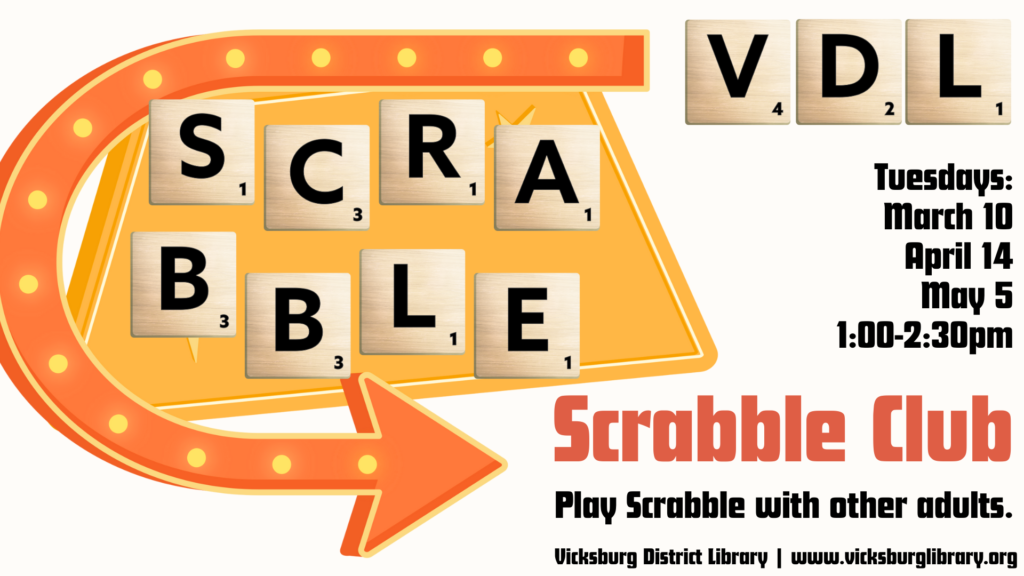 Play the board game Scrabble with other adults at the library. Scrabble Club meets on Tuesdays, March 10, April 14, & May 5 from 1:00-2:30pm.