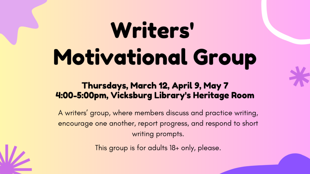 A writers’ group where members discuss and practice writing, encourage one another, report progress, and respond to short writing prompts. This program is for adults only. We meet from 4:00-5:00pm on Thursdays, March 12, April 9, & May 7.