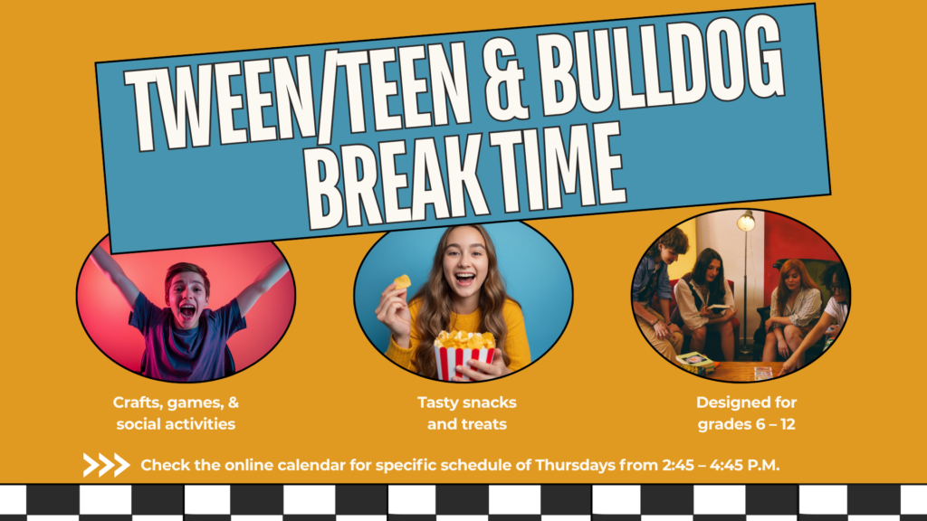 Bulldog Break Time is a biweekly event for teens and tweens to get together and have fun. We have crafts, games, social activities, and tasty treats. Check the online calendar for specific schedule of Thursdays from 2:45 – 4:45P.M. For grades 6 – 12.